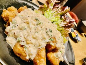 ひなはる店長が作るプリプリの鶏ももチキン南蛮です。酸味のある甘ダレに、らっきょうやミョウガ、三つ葉などの薬味を混ぜ込んだ特製タルタルソースを合わせ、ボリューム満点でとても美味しいかったです。